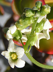 M. horridus flowers are generally white with flat petals and have a rough surface. Male M. horridus flowers are the most bell-shaped of the genus and hang from the bloomstem on short curved stems. Female flowers appear singly at the base of the male bloomstem and are less bell-shaped.