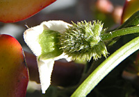 The densly prickled fruit of M. horridus are the largest of the genus and hang from the vines on long stems. The smooth, hard seeds are also the largest of the genus and taper to a pointed end. Like all manroot, the fruit swells as it ripens before ejecting the large seeds.