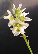 Flowers are white and appear in clusters on upright male bloomstems with solitary female flowers hanging from the base of the bloomstem.